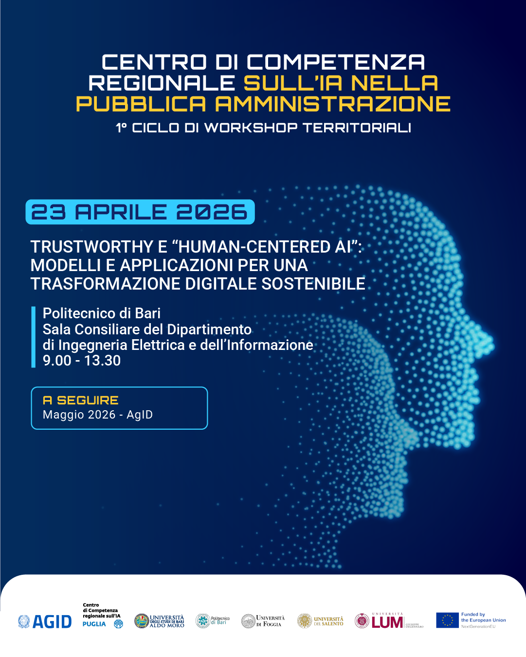 Prosegue il 1° ciclo di workshop territoriali del Centro di Competenza regionale sull’Intelligenza Artificiale nella Pubblica Amministrazione, promosso dalla Regione Puglia in collaborazione con AgID, InnovaPuglia, Università degli Studi di Bari Aldo Moro, Politecnico di Bari, Università del Salento, Università degli Studi di Foggia e Università LUM.