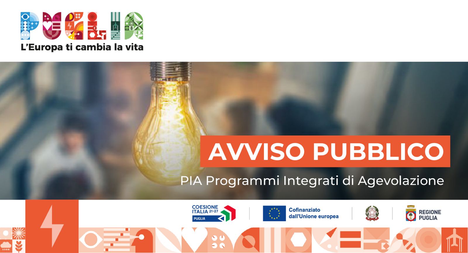 La Sezione Competitività informa che sul Bollettino Ufficiale della Regione Puglia n. 112 del 21 dicembre 2023 (e relativi aggiornamenti sul BURP n. 34 del 26/04/2024, sul BURP n. 9 straordinario del 30/07/2024, sul BURP n. 17 Supplemento 1 del 25 febbraio 2025 e sul BURP n. 67 del 21/08/2025) è stato pubblicato l’Avviso Pubblico “PIA – Programmi Integrati di Agevolazione”, strumento per la concessione di agevolazioni alle medie e alle piccole imprese per attività di ricerca industriale, sviluppo sperimentale, innovazione tecnologica ed industriale, digitalizzazione e transizione energetica ed ambientale, oltre allo sviluppo e qualificazione delle competenze al fine di consolidare e rafforzare la competitività del sistema economico regionale, sviluppandone le specializzazioni produttive e costituisce una procedura attivabile nell’ambito del PR.
