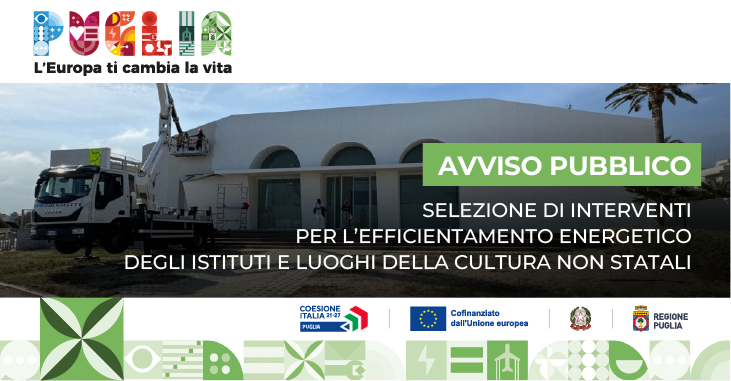 Con determinazione della Dirigente della Sezione Tutela e Valorizzazione dei Patrimoni Culturali n. 209 dell’11/09/2025 e successiva determinazione di rettifica n. 211 del 16/09/2025 (pubblicate sul Bollettino Ufficiale n. 77 del 25/09/2025) è stato approvato l’Avviso Pubblico “Avviso per la selezione di proposte progettuali finalizzate all’efficientamento energetico dei luoghi della cultura pubblici non statali” - PR Puglia 2021-2027 –Priorità 2 “Economia verde” - Azione 2.1 “Efficientamento energetico di edifici pubblici” - Sub-Azione 2.1.2.“Interventi per l’efficientamento energetico degli istituti e luoghi della cultura non statali”.