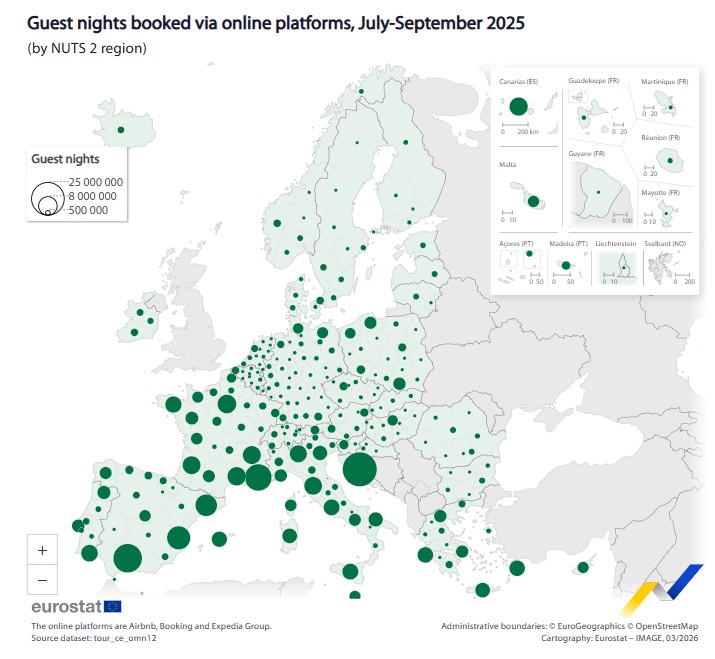 L'ufficio statistico europeo (Eurostat) pubblica una nota statistica sulle prenotazioni online di affitti brevi effettuate tramite le principali piattaforme di booking online. I dati pubblicati sono al quarto trimestre 2025 a livello nazionale e al terzo trimestre 2025 a livello regionale.